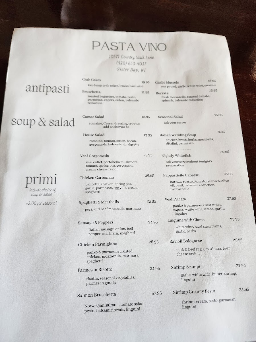 Welcome to Pasta Vino - Sister Bay, a delightful destination nestled in Sister Bay, Wisconsin. This family-owned gem offers a curated menu that speaks to the heart of Italian cuisine, featuring a delightful range of primi dishes such as the creamy Chicken Carbonara, succulent Veal Piccata, and the crowd favorite, Spaghetti & Meatballs. Each dish is crafted with fresh ingredients, ensuring a rich and authentic experience.